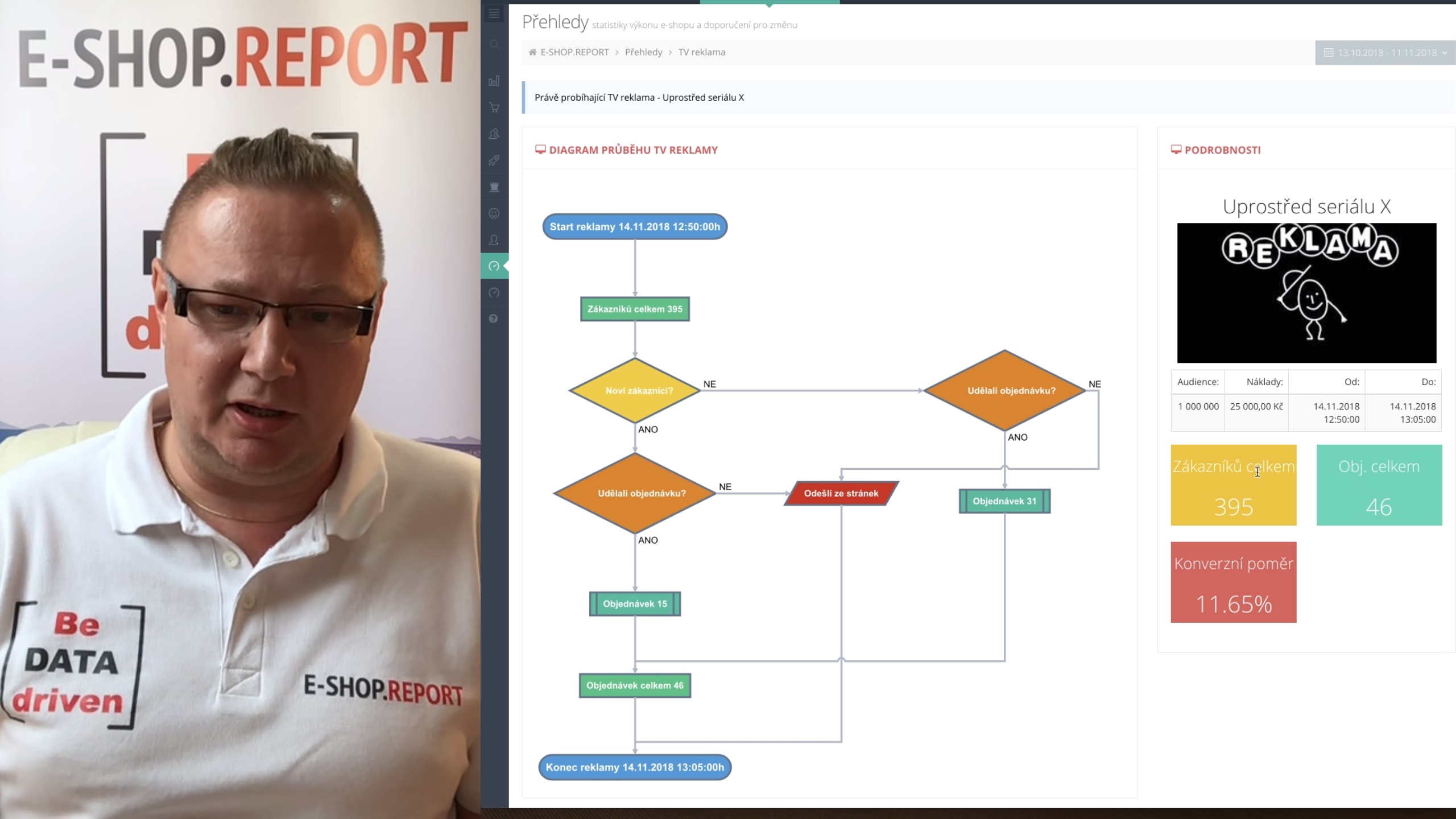 Jak jste si u nás již jistě zvykli, a ve videu je vidět, nespokojíme se jen se staticky zobrazenými čísly, ale dokážeme vše zobrazovat v reálném čase - tedy i vy vidíte, jaká zrovna běží reklama, v grafu pak, kolik máte zákazníků celkem, kolik objednávek od nových zákazníků a jaká je konverze během reklamy.